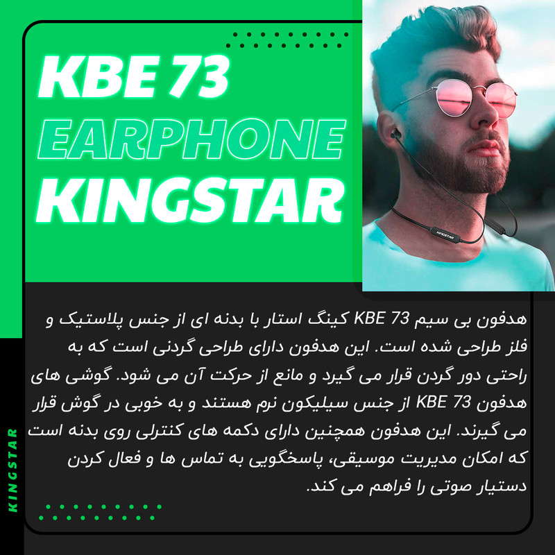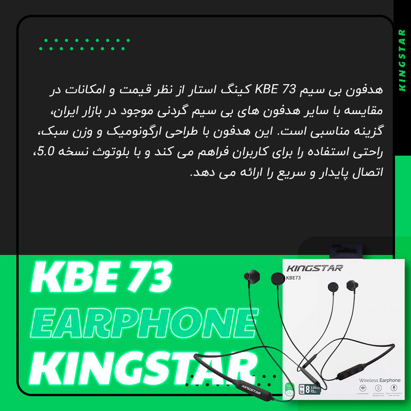 هدفون بی سیم KBE 73 کینگ استار یک هدفون بلوتوثی گردنی است که توسط شرکت کینگ استار تولید شده است. این هدفون با طراحی ارگونومیک و وزن سبک، راحتی استفاده را برای کاربران فراهم می کند. KBE 73 مجهز به بلوتوث نسخه 5.0 است که امکان اتصال پایدار و سریع را فراهم می کند.هدفون بی سیم KBE 73 کینگ استار با بدنه ای از جنس پلاستیک و فلز طراحی شده است. این هدفون دارای طراحی گردنی است که به راحتی دور گردن قرار می گیرد و مانع از حرکت آن می شود. گوشی های هدفون KBE 73 از جنس سیلیکون نرم هستند و به خوبی در گوش قرار می گیرند. این هدفون همچنین دارای دکمه های کنترلی روی بدنه است که امکان مدیریت موسیقی، پاسخگویی به تماس ها و فعال کردن دستیار صوتی را فراهم می کند.هدفون بی سیم KBE 73 کینگ استار از نظر قیمت و امکانات در مقایسه با سایر هدفون های بی سیم گردنی موجود در بازار ایران، گزینه مناسبی است. این هدفون با طراحی ارگونومیک و وزن سبک، راحتی استفاده را برای کاربران فراهم می کند.