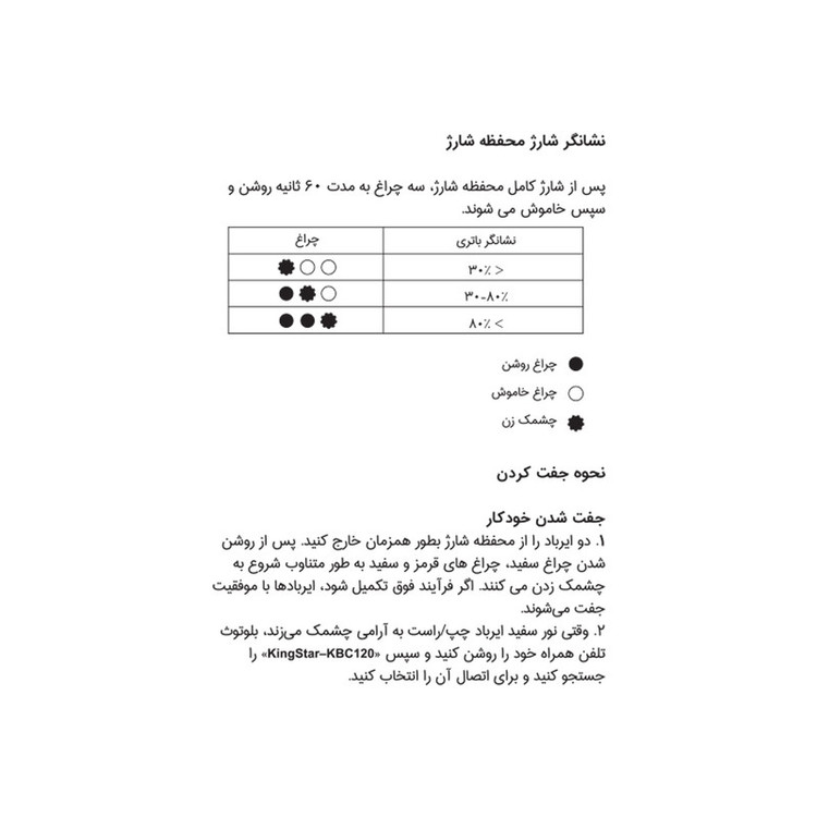 ایرباد آهنربایی کینگ استار مدل KBC120 از جدیدترین و کاربردی ترین محصولات کینگ استار است که به تازگی روانه بازار جهانی شده است. این محصول علاوه بر طراحی شیک و زیبا و کیفیت صدایی عالی دارای قابلیت اسمارت تاچ میباشد. محدوده عملکرد این ایرباد تا 10 متر است بنابراین با این مقدار فاصله از گوشیتان به راحتی میتوانید با آن کار کنید؛ موزیک گوش کنید و یا صحبت کنیداین محصول دارای ظرفیت 4 ساعته جهت مکالمه و 60 ساعته درحالت استندبای میباشد. همچنین برای استفاده از این محصول نیاز به داشتن نسخه بلوتوث 5 است. از دیگر پارامترهای قابل توجه برای استفاده از ایربادز بیسیم کینگ استار مدل KBC120، تعداد دفعات شارژ گوشی هاست که 6بار انجام میپذیرد و هربار حدود 2 ساعت جهت شارژ کامل آنها زمان نیاز خواهد داشت. مقدار ظرفیت جعبه شارژ ایربادز نیز 580 میلی آمپر و زمان شارژ آن نیز حدود 3 ساعت میباشد. دفترچه راهنما به همراه کابل شارژ تایپ سی و دو جفت سری سیلیکونی از اقلام همراه این محصول به شمار میروند.در مجموع میتوان گفت برای کسانی که قصد خرید یک ایربادز خوب و با کیفیت با قابلیتهای در حد استاندارد دارند ایربادز آهنربایی کینگ استار مدل KBC120 انتخاب مناسبی است.
