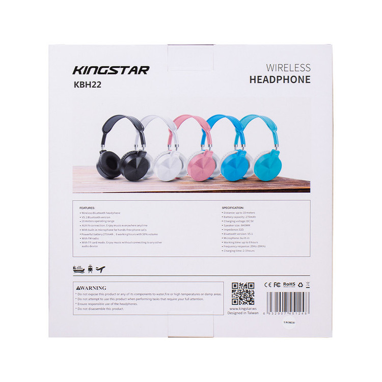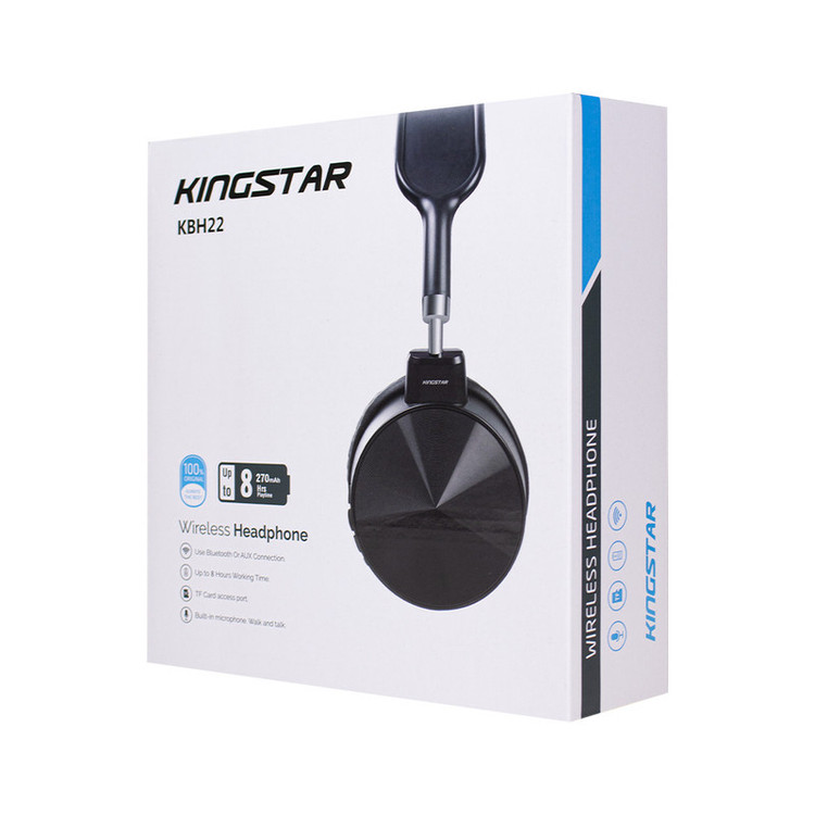 هدفون KBH22 با قابلیت استفاده هم با بلوتوث و هم با کابل AUX همراه با طراحی بسیار زیبا طرفداران زیادی را جذب خود کرده است.اگر بخواهیم از ویژگیهای ظاهری شروع کنیم ابتدا باید به این مورد اشاره کنیم در رنگهای مختلف عرضه شده است. همچنین دارای دو بلندگو با سایز 40 میلیمتر میباشد که موجب شده بعد از استفاده طولانی مدت گوشهایتان اذیت نشوند.از امکانات این محصول میتوان به پشتیبانی از درگاه microUSB برای شارژ شدن هدفون، پشتیبانی از کابل AUX برای اتصال باسیم به دستگاه پلیر، پشتیبانی از رادیو موج FM و بلوتوث ورژن 5.1 با برد عملیاتی 10 متر را نام برد. میتوانید این محصول را علاوه بر بلوتوث با کابل AUX نیز به پلیر خود متصل نمایید. بدون نویز و صداهای آزار دهنده به موسیقی دلخواهتان گوش فرا دهید و از قابلیتهای این محصول که در تصویر زیر قابل مشاهده است بهرهمند شوید.اما از مشخصههای بارز در طراحی این محصول قابلیت چرخش گوشیهای چرمی هدفون میباشد.این محصول زیبا و شیک شرکت کینگ استار با ظرفیت باتری داخلی لیتیوم قابل شارژ 270 میلیآمپر یک میکروفون داخلی با قابلیت مکالمه همانند هندزفری را نیز داراست. همچنین زمان پخش موسیقی این محصول با ولتاژ شارژ 5 ولت تا 8 ساعت با 50٪ حجم صدا است. هدبند این محصول نیز از جنس پلاستیک ABS میباشد. قابلیت افزایش یا کاهش ارتفاع در این قسمت آن را برای استفاده هر کاربری مناسب میکند. هدفون بلوتوثی کینگ استار مدل KBH22 فرکانس 20 هرتز تا 20 کیلوهرتز را پشتیبانی میکند.با توجه به این فرکانس پاسخگویی، میتوان تمام صداهای یک موسیقی را به طور کامل و به وضوح شنید و از آن لذت برد. امپدانس بلندگوهای آن نیز 32 اهم میباشد که از دیگر عوامل صدای با کیفیت این کالاست. از دیگر مشخصات فنی این هدفون خروجی مجاز 110 میلیوات و ولتاژ عملیاتی 3.3 و 4.2 ولت است. برای شارژ این محصول نیز حدود 2 الی 3 ساعت زمان لازم است.درنهایت آخرین نکتهای که در رابطه با هدفون KBH22 باقی میماند بحث محتویات درون پک محصول است که شامل یک عدد کابل شارژ micro-usb و یک عدد دفترچه راهنمای کاربر میباشد.