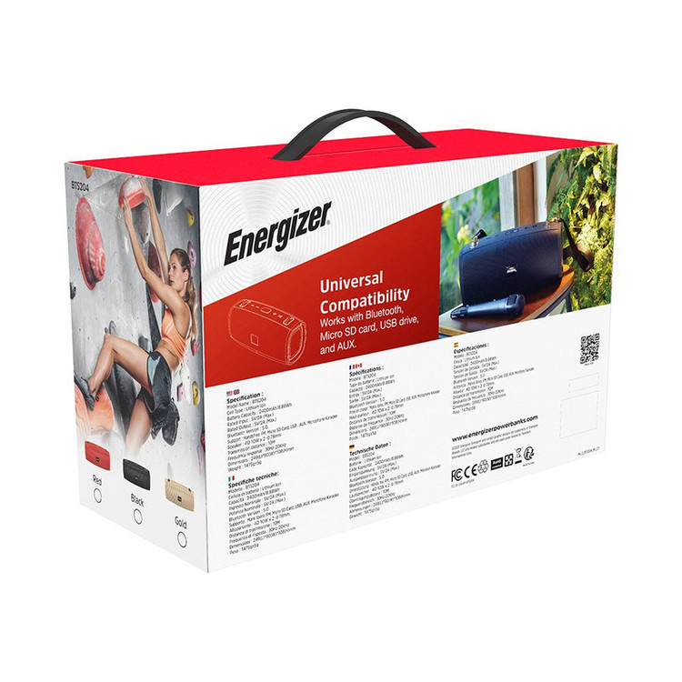 اسپیکر بلوتوث BTS204 انرجایزر کیفیت صدای مطلوبی را پشتیبانی میکند. اسپیکر بلوتوثی BTS204 انرجایزر از رادیو FM پشتیبانی میکند. همچنین این اسپیکر علاوه بر بلوتوث و رادیو از فلش مموری و کارت میکرو نیز پشتیبانی میکند. دکمه وسط دکمه خاموش و روشن اسپیکر بلوتوث انرجایزر است و برای کانال یابی و جستجوی موسیقی میتوانید با نگهداشتن چندثانیهای دکمههای + زیاد و – کم کردن صدای اسپیکر این عمل را انجام دهید. برای متصل کردن قابلیت بلوتوث اسپیکر بلوتوث BTS204 با دستگاه پلیر خود اسپیکر و بلوتوث گوشیريال پلیر خود را روشن کرده و در بین نامهای ظاهرشده در صفحه جستجوی بلوتوث BTS204 را انتخاب کنید. هنگام اتصال با بلوتوث لازم نیست که پلیر یا گوشی خود را در کنار آن قرار دهید، این محصول برد عملیاتی 10 متر را پشتیبانی میکند. همینطور این محصول از میکروفون داخلی برخوردار است و قابلیت مکالمه را در هنگام اتصال تماس داراست. توان خروجی این اسپیکر 10 وات است که با توجه بهاندازه این اسپیکر از توان خروجی عالی برخوردار است. ظرفیت باتری این محصول 2400میلیآمپرساعت است و شما میتوانید حدود 6 ساعت مداوم با آن به موسیقی موردعلاقه خود گوش فرا دهید.