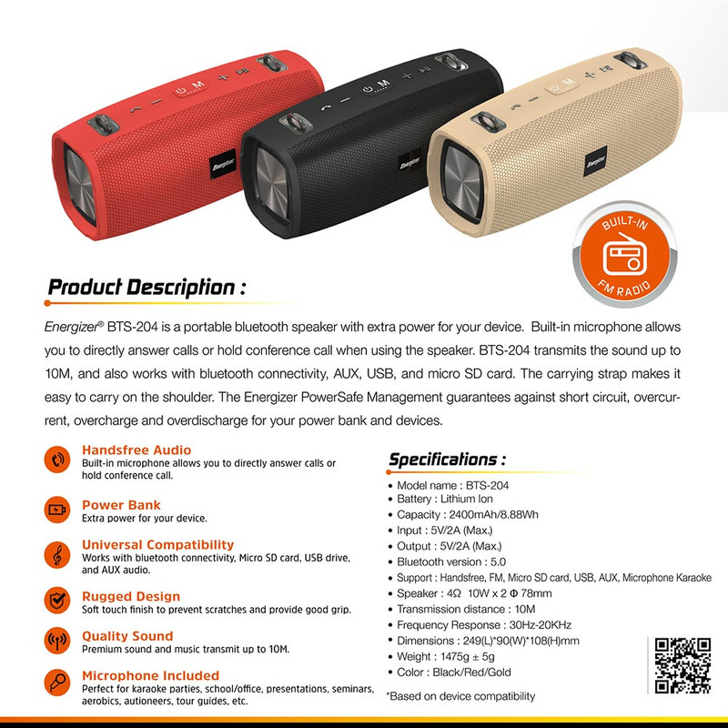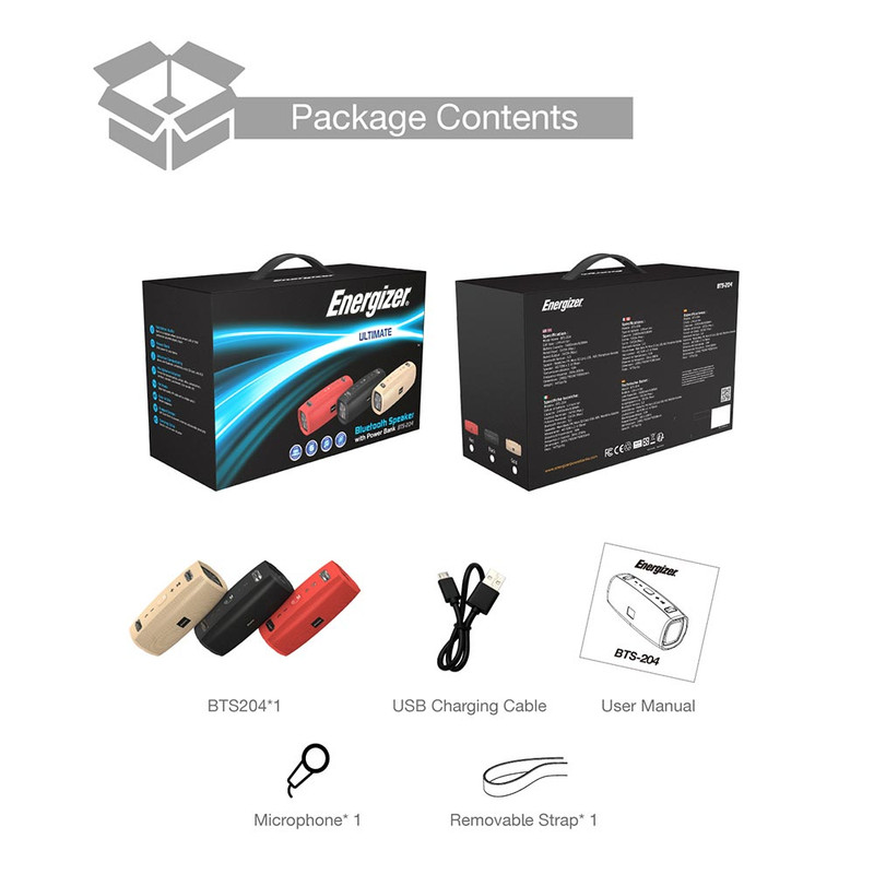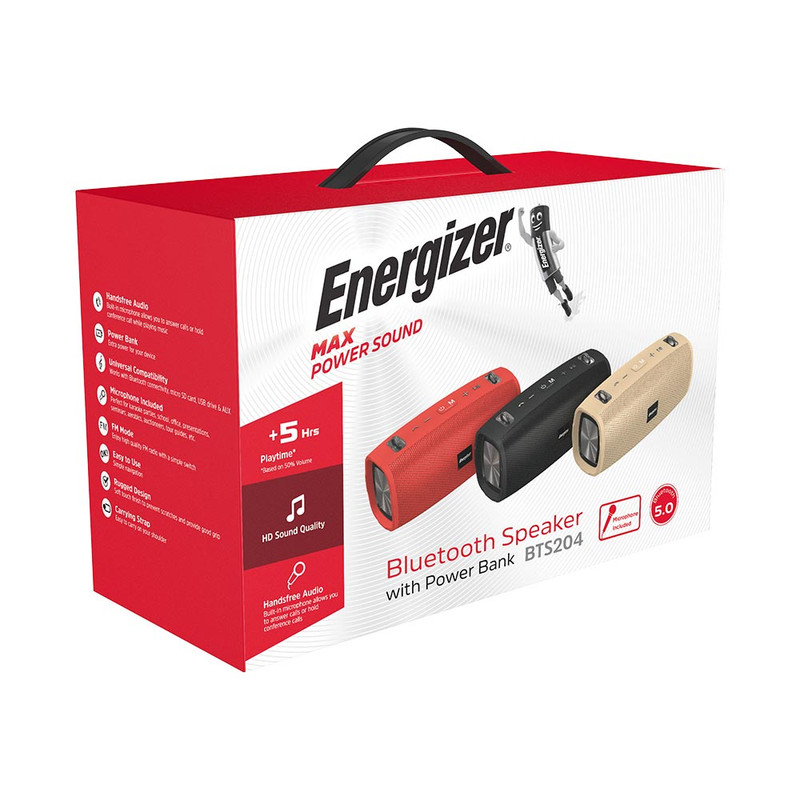 اسپیکر بلوتوث BTS204 انرجایزر کیفیت صدای مطلوبی را پشتیبانی میکند. اسپیکر بلوتوثی BTS204 انرجایزر از رادیو FM پشتیبانی میکند. همچنین این اسپیکر علاوه بر بلوتوث و رادیو از فلش مموری و کارت میکرو نیز پشتیبانی میکند. دکمه وسط دکمه خاموش و روشن اسپیکر بلوتوث انرجایزر است و برای کانال یابی و جستجوی موسیقی میتوانید با نگهداشتن چندثانیهای دکمههای + زیاد و – کم کردن صدای اسپیکر این عمل را انجام دهید. برای متصل کردن قابلیت بلوتوث اسپیکر بلوتوث BTS204 با دستگاه پلیر خود اسپیکر و بلوتوث گوشیريال پلیر خود را روشن کرده و در بین نامهای ظاهرشده در صفحه جستجوی بلوتوث BTS204 را انتخاب کنید. هنگام اتصال با بلوتوث لازم نیست که پلیر یا گوشی خود را در کنار آن قرار دهید، این محصول برد عملیاتی 10 متر را پشتیبانی میکند. همینطور این محصول از میکروفون داخلی برخوردار است و قابلیت مکالمه را در هنگام اتصال تماس داراست. توان خروجی این اسپیکر 10 وات است که با توجه بهاندازه این اسپیکر از توان خروجی عالی برخوردار است. ظرفیت باتری این محصول 2400میلیآمپرساعت است و شما میتوانید حدود 6 ساعت مداوم با آن به موسیقی موردعلاقه خود گوش فرا دهید.