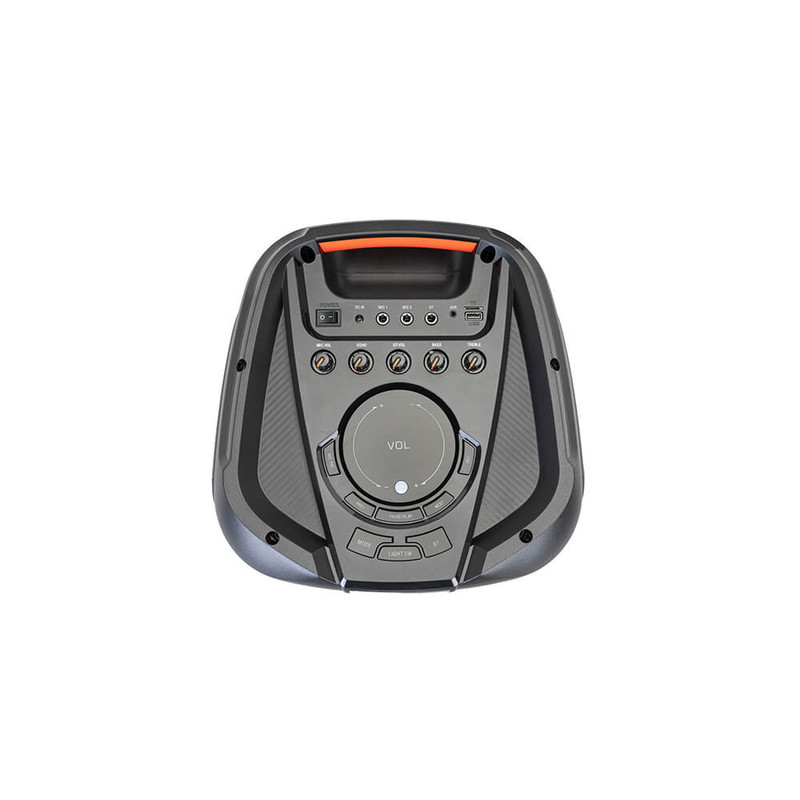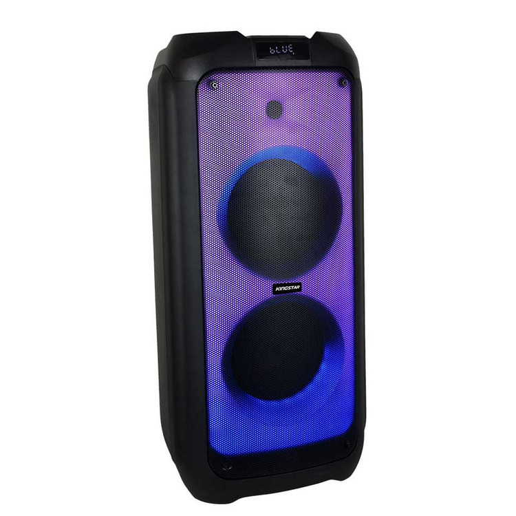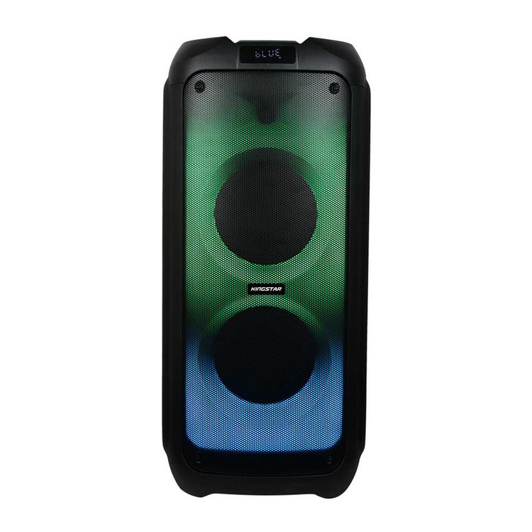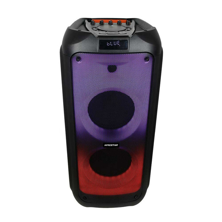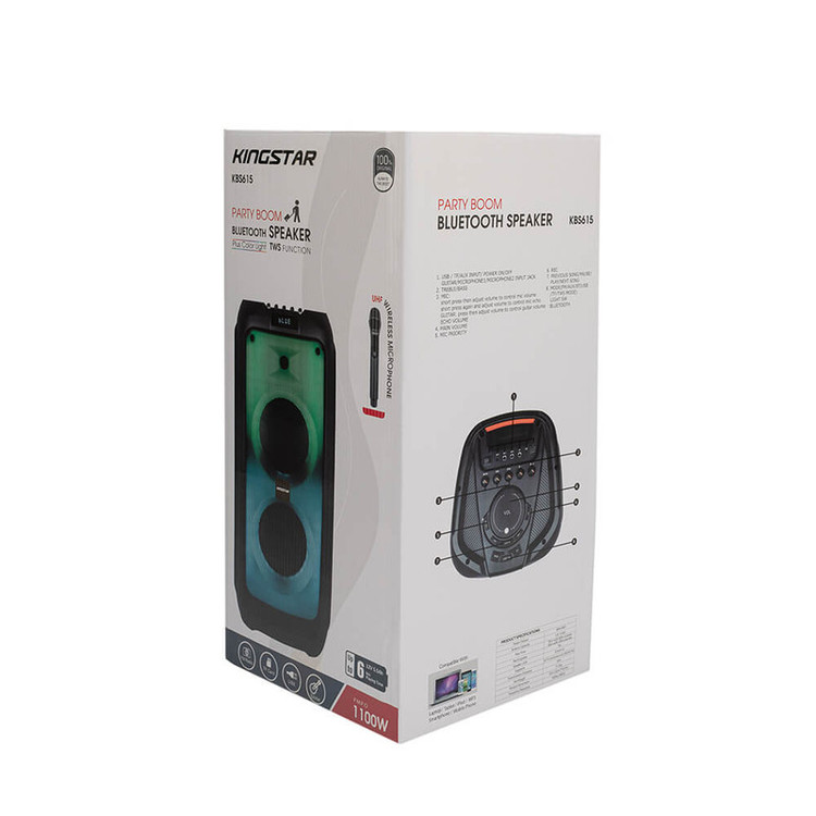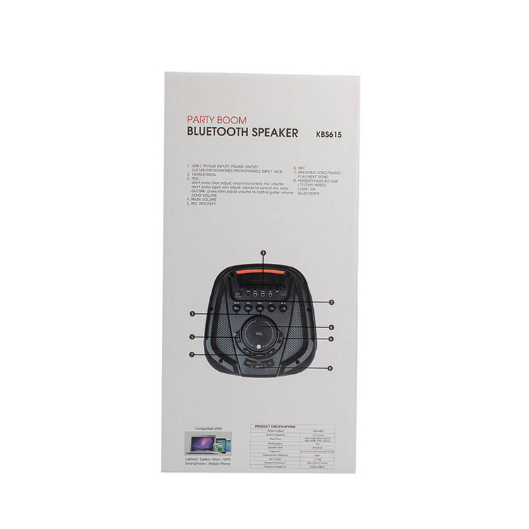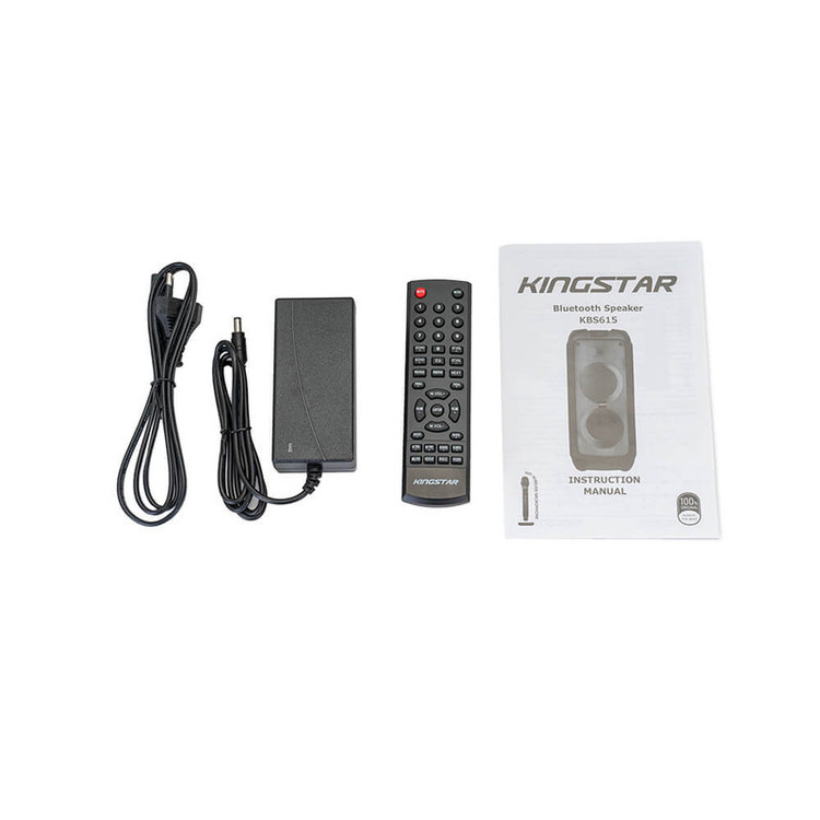 اسپیکر بلوتوث قابل حمل کینگ استار مدل kbs615 به صورت فول ال ای دی و قدرت پخش و کیفیت بالا یکی از بهترینهای این برند است.مدت زمان شارژ این اسپیکر بین 5 تا 6 ساعت است. پشتیبانی از رادیو FM، ورودی AUX، ورودی کارت حافظه،ورودی USB، ورودی میکروفون قابلیت سینک شدن همزمان با اسپیکر هم نام دیگر و امکان متصل کردن گیتار از قابلیتهای این دستگاه است. زمان استفاده 5 ساعت با 80% حجم صدا, 6 ساعت با 50% حجم صدا است.این اسپیکر قابلیت ضبط صدا دارد و توان 80W RMS استاندارد CE,FCC,RoHS سازگار با لپتاپ/ تبلت/ آیپاد/ MP3/ گوشیهای هوشمند است. این اسپیکر دارای ریموت کنترل و میکروفون وایرلس و دارای آداپتور برای شارژ دستگاه است.
