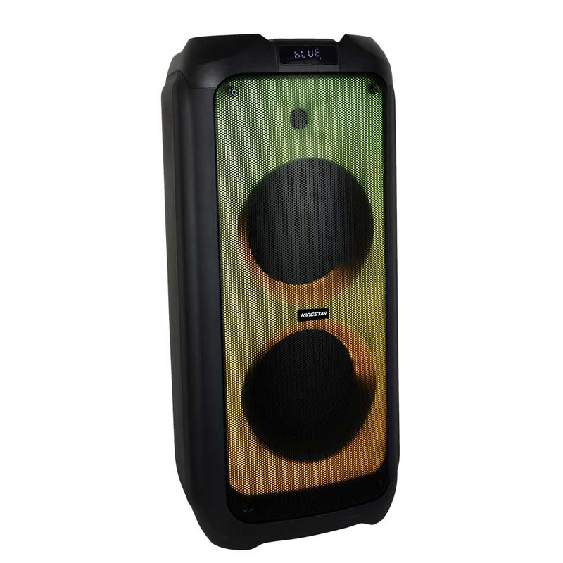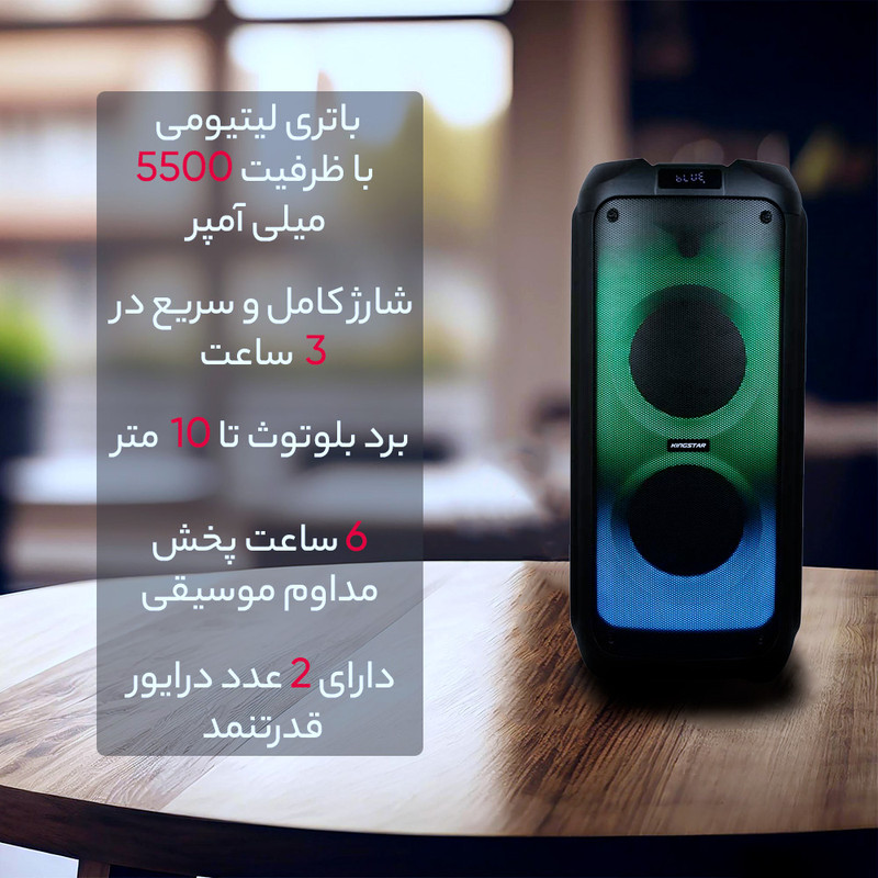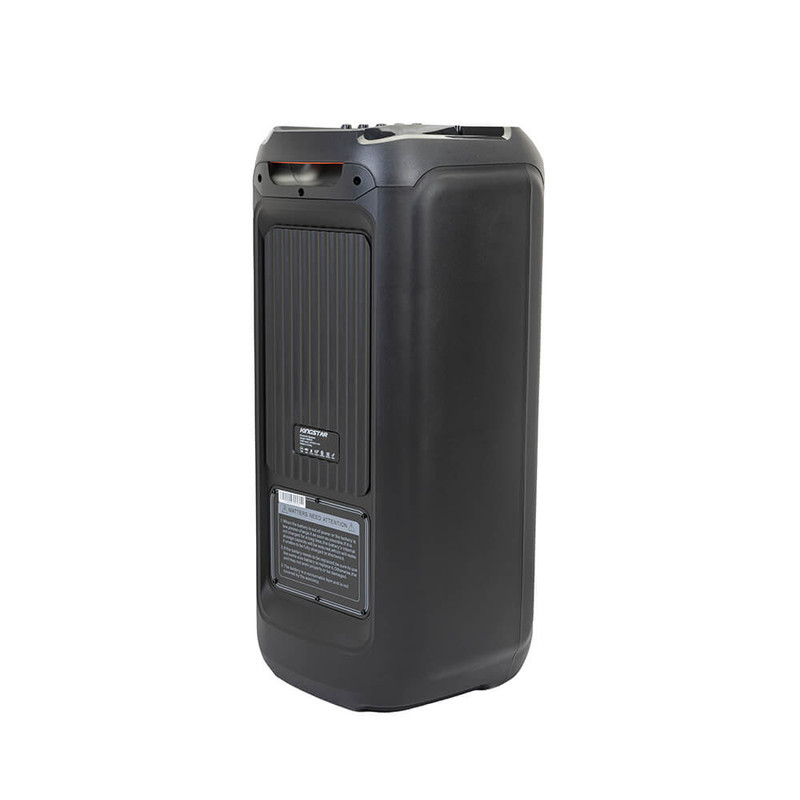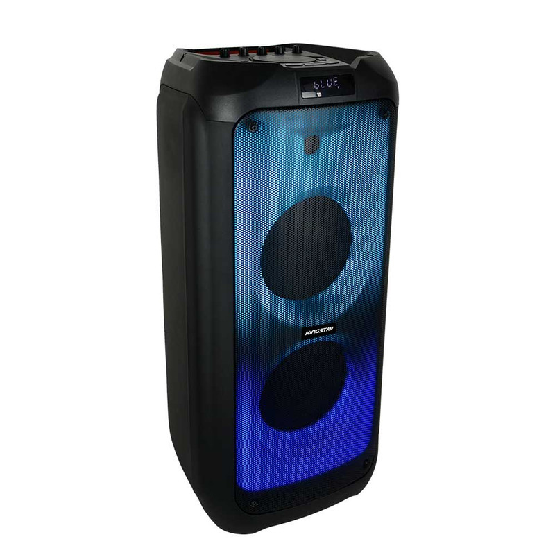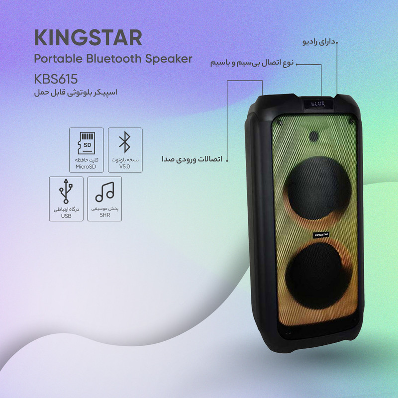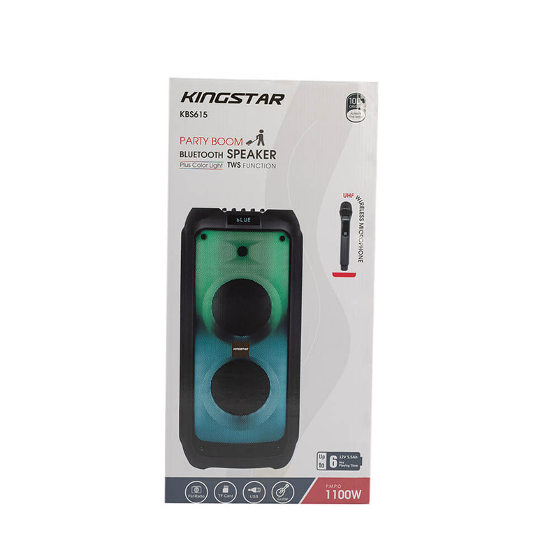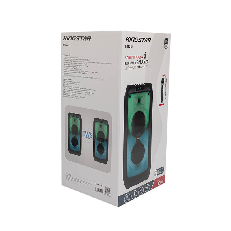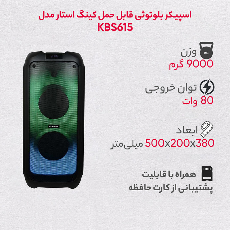 اسپیکر بلوتوث قابل حمل کینگ استار مدل kbs615 به صورت فول ال ای دی و قدرت پخش و کیفیت بالا یکی از بهترینهای این برند است.مدت زمان شارژ این اسپیکر بین 5 تا 6 ساعت است. پشتیبانی از رادیو FM، ورودی AUX، ورودی کارت حافظه،ورودی USB، ورودی میکروفون قابلیت سینک شدن همزمان با اسپیکر هم نام دیگر و امکان متصل کردن گیتار از قابلیتهای این دستگاه است. زمان استفاده 5 ساعت با 80% حجم صدا, 6 ساعت با 50% حجم صدا است.این اسپیکر قابلیت ضبط صدا دارد و توان 80W RMS استاندارد CE,FCC,RoHS سازگار با لپتاپ/ تبلت/ آیپاد/ MP3/ گوشیهای هوشمند است. این اسپیکر دارای ریموت کنترل و میکروفون وایرلس و دارای آداپتور برای شارژ دستگاه است.