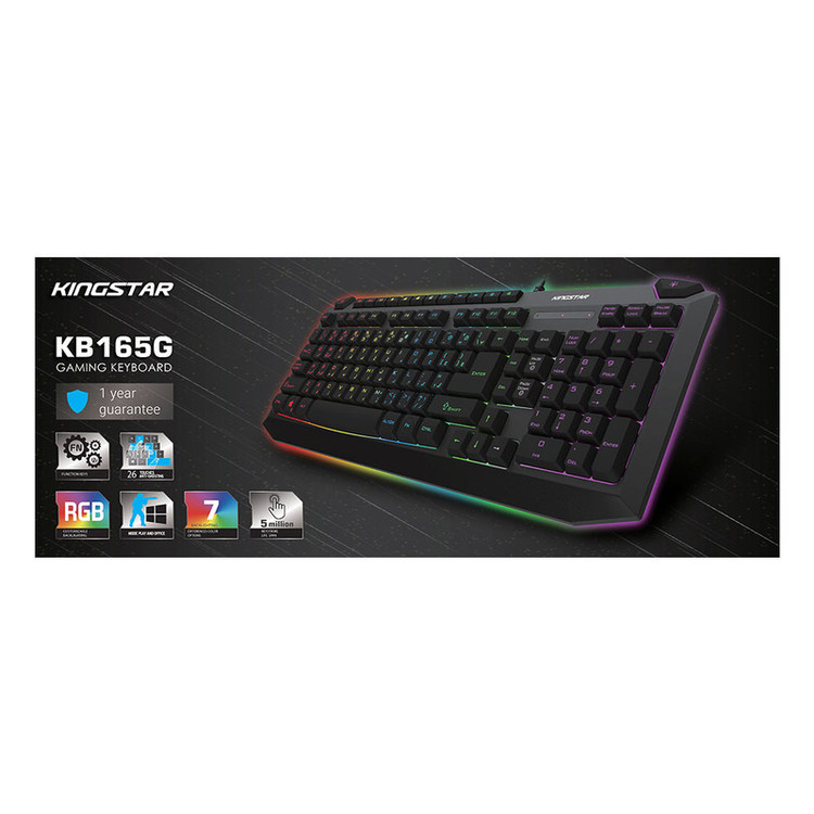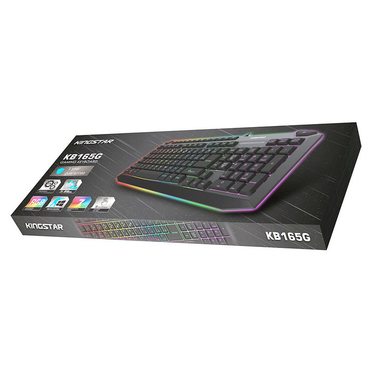کیبورد مدل KB165G یک محصول با کیفیت از کمپانی کینگ استار است که با نورپردازی زیبای خود توجه هر کاربری را به خود جلب میکند. نورپردازی کیبورد سه رنگ به صورت ثابت در کنارههای کلیدها است و قابل تغییر به صورت اتوماتیک میباشد. این محصول دارای 117 کلید اصلی و 14 کلید مولتی مدیا و همچنین توان DC 5V = 300 میلی آمپر است.از نکات برجستهی محصول کیبورد گیمینگ کینگ استار مدل kb165g میتوان به سازگاری آن با اکثر سیستم عاملهای پرکاربرد ازجمله Linux, Mac OS, Windows All Versions اشاره کرد. با استفاده از یک کابل 180 سانتی متری از طریق پورت USB به سیستم متصل میگردد. همچنین دارای 600 گرم وزن و طول عمر 10 میلیون بار کلیک جهت استفاده کاربران میباشد.