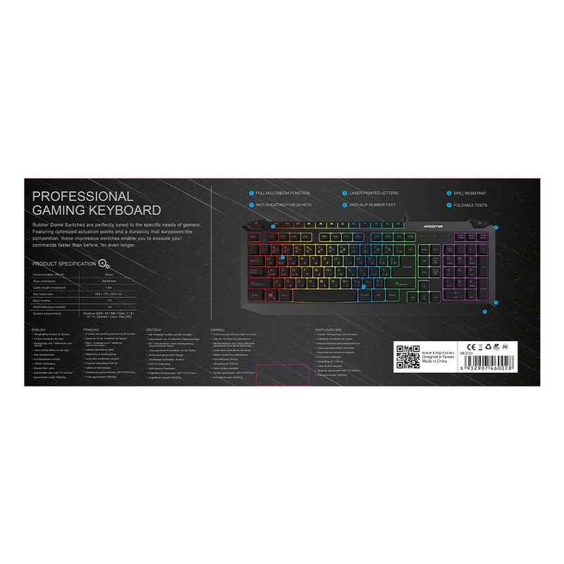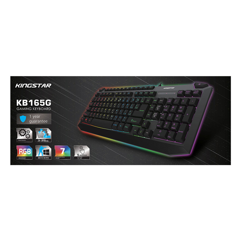 کیبورد مدل KB165G یک محصول با کیفیت از کمپانی کینگ استار است که با نورپردازی زیبای خود توجه هر کاربری را به خود جلب میکند. نورپردازی کیبورد سه رنگ به صورت ثابت در کنارههای کلیدها است و قابل تغییر به صورت اتوماتیک میباشد. این محصول دارای 117 کلید اصلی و 14 کلید مولتی مدیا و همچنین توان DC 5V = 300 میلی آمپر است.از نکات برجستهی محصول کیبورد گیمینگ کینگ استار مدل kb165g میتوان به سازگاری آن با اکثر سیستم عاملهای پرکاربرد ازجمله Linux, Mac OS, Windows All Versions اشاره کرد. با استفاده از یک کابل 180 سانتی متری از طریق پورت USB به سیستم متصل میگردد. همچنین دارای 600 گرم وزن و طول عمر 10 میلیون بار کلیک جهت استفاده کاربران میباشد.