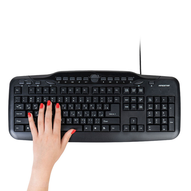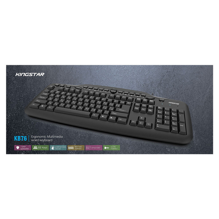 کیبورد کینگ استار مدل kb76 از نوع سیم دار میباشد و از طریق درگاه USB به کامپیوتر متصل میشود. این کیبورد دارای 122 کلید برای انجام فعالیتهای کامپیوتری است. همچنین کیبورد kb76 دارای 18 کلید میانبر به منظور انجام سریعتر کارهاست که عبارتند از Search, Dormant, Refresh, Back, Forward, Power, E-mail, Music, Play/Pause, Pre Track, Next Track, Volume +-, Web Home, My Computer. کیبورد کینگ استار مدل kb76 برای استفادههای روزمره مناسب میباشد. از دیگر ویژگیهای این کیبورد محصول کمپانی کینگ استار، طراحی کلیدها به گونهای که امکان تایپ کردن در مدت زمانی طولانی را فراهم می کند، دسترسی راحت به تمامی کلیدهای کاربردی، طراحی نرم و سایلنت کلیدها، با دوام و دارای کلیدهای مات میباشد. امروزه محصول Kb76 کمپانی کینگ استار به دلیل داشتن کلیدهای بی صدا هنگام تایپ توجه بسیاری را به خود جلب کرده و همین امر موجب شده تا به یکی از پرفروش ترین محصولات کینگ استار تبدیل شود.
