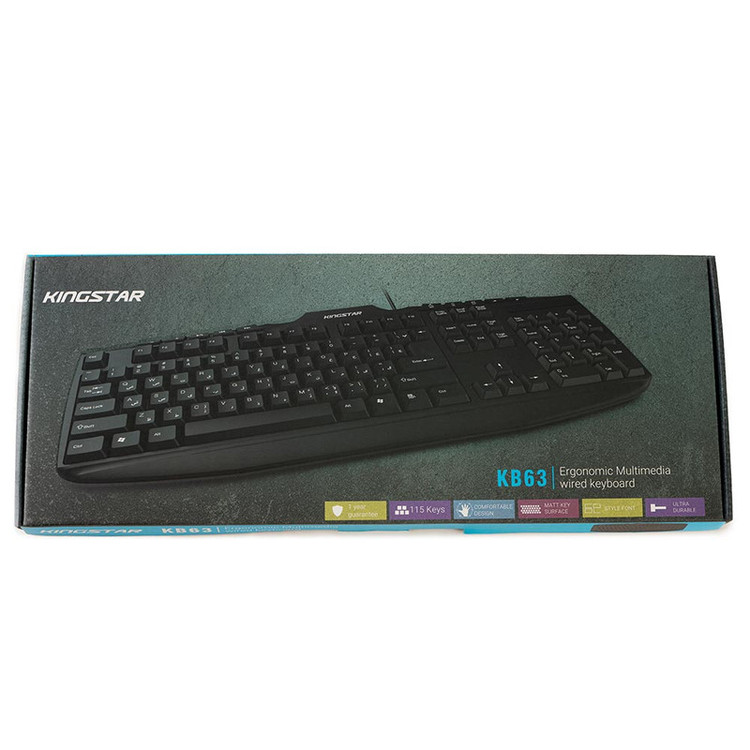 کیبورد «KB63» محصولی از شرکت «کینگستار» است که به صورت باسیم و از طریق درگاه USB به کامپیوتر متصل میشود. این کیبورد دارای 115 کلید برای انجام فعالیتهای کامپیوتری است؛ همچنین کیبورد KB63 دارای 14 کلید میانبر برای انجام سریعتر کارهاست که در قسمت بالایی کیبورد قرار گرفتهاند. کیبورد کینگستار مدل KB63 برای استفادههای روزمره و اداری میتواند گزینهی مناسبی باشد. شرکت کینگستار این محصول را برای کاربران فارسیزبان طراحی کرده و به همین منظور کلیدهای آن را به برچسب چاپی فارسی تجهیز کرده است. کلیدهای این کیبورد در فاصلهی مناسبی از هم قرار گرفتهاند که این ویژگی باعث بیشترشدن سرعت تایپ و راحتی کاربر هنگام استفاده میشود. اگر قصد تهیهی یک کیبورد برای استفادههای اداری و خانگی را دارید، KB63 میتواند انتخاب مناسبی برای شما باشد.