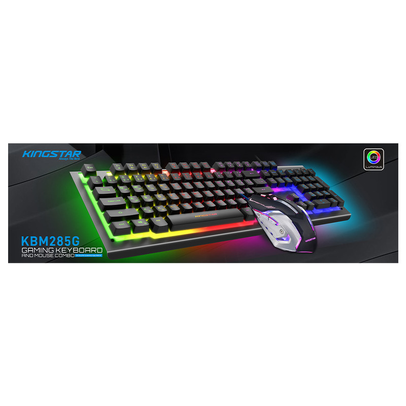 کیبورد کمبو کینگ استار مدل kbm285G دارای طراحی ارگونومیک و دکمه های حساس هنگام فعالیت میباشد. از مشخصههای این محصول کمپانی کینگ استار، عنوان کمبو میباشد. این نام به جهت وجود دو محصول ماوس و کیبورد در یک پک انتخاب شده است. کیبورد کمبو به گونهای طراحی شده است که زیر کلیدها نورپردازی زیبای RGB شکل گرفته است. روکش ژلاتینی بسیار با کیفیت بکار رفته زیر کلیدهای این کیبورد موجب شده تا طول عمر این محصول به 5میلیون بار کلیک افزایش پیدا کند که این میزان قابل توجهی برای کاربران محصولات گیمینگ میباشد. ازدیگر نکات قابل توجه در طراحی کلیدهای این کیبورد گیمینگ میتوان به مقاوم بودن آنها دربرابر پاشیده شدن آب روی آنها اشاره کرد که موجب رضایت بسیاری از کابران این محصول شده است. یک جک پایه هم در زیر کیبورد جهت قرارگیری راحتتر آن بر روی میز تعبیه شده است. این کیبورد همچنین دارای کابلی با ضخامت 3.2میلیمتر و طول 1.5متر میباشد که با پورت USB قابلیت اتصال به دستگاههای شامل این پورت را دارند. ولتاژ و جریان این محصول نیز به ترتیب 5ولت و 100میلیآمپر میباشد. کیبورد کمبو kbm285G با ابعاد 448x158x48 میلیمتر و وزن 670±10 گرم با سیستم عاملهای ویندوز 2000/XP/Vista/7/8/10/11 نیز سازگار میباشد.