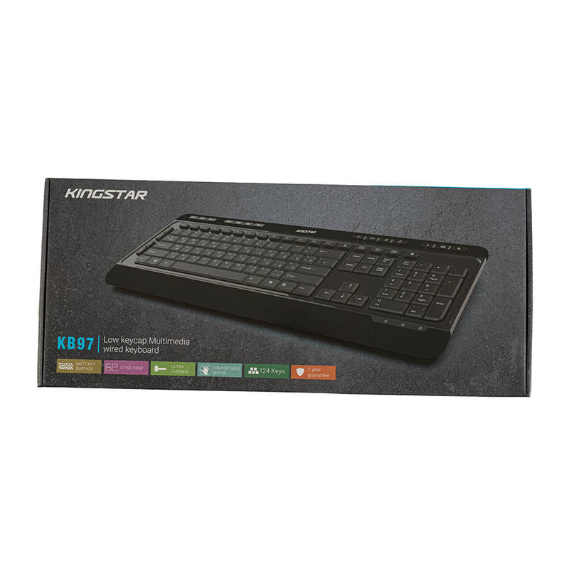کیبورد کینگ استار مدل kb97 از نوع سیم دار میباشد و از طریق درگاه USB به کامپیوتر متصل میشود. این کیبورد دارای 124 کلید برای انجام فعالیتهای کامپیوتری است. همچنین کیبورد kb97 دارای 17 کلید میانبر به منظور انجام سریعتر کارهاست که عبارتند از Prev. Page, Next Page, Web Home, email, Search, Refresh, Setting, Play/Pause, Prev. Track, Next Track, Stop, Volume, Mute, Music, Sleep, Awake, Power. کیبورد کینگ استار مدل kb97 برای استفادههای روزمره مناسب میباشد. از دیگر ویژگیهای این کیبورد محصول کمپانی کینگ استار، طراحی کلیدها به گونهای که امکان تایپ کردن در مدت زمانی طولانی را فراهم می کند، دسترسی راحت به تمامی کلید های کاربردی، طراحی نرم و سایلنت کلید ها، با دوام و دارای کلید های مات میباشد.