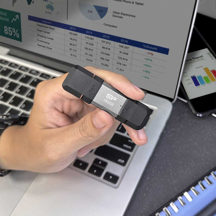 در عصر ارتباطات فلش مموریها جایگاه قابل توجهی در میان مردم و تکنولوژی پیدا کرده است. امروزه اکثر اطلاعات در یک حافظه کوچک در قالب فلش مموری جای میگیرد. بنابراین باید در انتخاب فلش مموری که ویژگیهای ظاهری و پشتیبان خوبی باشد دقت کرد. فلش مموری سیلیکون پاور مدل C51 دارای طراحی زیبا و منحصر به فردی است. به دلیل جنس آلومینیوم و رابر خود محافظ خوبی برای اطلاعات شما است. این فلش مموری زیبا با وزن 13.77 گرم و ابعاد 68.6 × 21.3 × 10.4 میلیمتر در رنگ نقرهای در بازار عرضه شده است. از مزایای بسیار مهم این محصول مقاوم بودن آن در برابر رطوبت، شوک و ضربه و گرد و غبار و همچنین دمای عملکرد آن که تا 70 درجه سانتیگراد است. نکته پرطرفدار و قابل توجه این محصول جدید رابط کاربری قابل استفاده در این فلش مموری است که یک سر آن USB Type-A و سر دیگر آن USB Type-C (USB 3.2 Gen 1) است. همین موضوع به شما امکان استفاده از آن با تلفن همراه هوشمند و تبلت و لپتاپ و انتقال فایل با سرعت بالا را خواهد داد. از استانداردهای بکار رفته در این فلش مموری میتوان به CE، FCC و BSMI اشاره کرد که با استاندارهای جهانی مطابقت دارد. این یکی از جدیدترین محصولات ساخت تایوان است که وارد بازار ایران شده است.