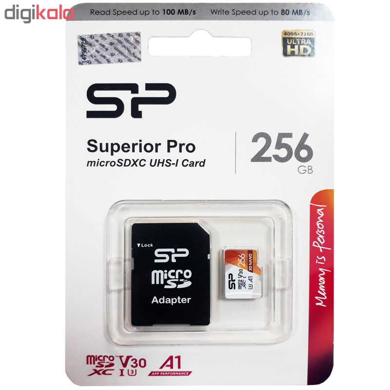کارت حافظهی 256 گیگابایتی «سیلیکون پاور» مدل Superior Pro از نوع microSD است و البته با استفاده از آداپتور SD آن با انواع لپتاپ، کامپیوتر و دیگر دستگاههای مجهز به درگاه کارت حافظهی SD هم سازگاری خواهد داشت و در صورت نیاز میتوانید از آن برای دسترسی به اطلاعات ذخیره شده روی کارت microSD استفاده کنید. شما با استفاده از این آداپتور میتوانید کارت حافظه را بدون نیاز به کارتخوان، به لپتاپ یا کامپیوترتان وصل کرده و به اطلاعات ذخیره شده روی آن دسترسی پیدا کنید. سرعت خواندن اطلاعات در این مدل حداکثر 100 مگابایت برثانیه است. همچنین سرعت نوشتن اطلاعات در این مدل هم حداکثر 80 مگابایت برثانیه خواهد بود. ابعاد این کارت حافظه به ترتیب طول، عرض و ضخامت 15، 11 و 1 میلیمتر هستند. بنابراین خیالتان راحت باشد که این مدل از سری محصولات سیلیکون پاور علاوه بر دوربینهای GoPro با اکثر گوشیهای موبایل، تبلت، دوربینهای ورزشی و دیگر لوازم از این قبیل که درگاه کارت حافظه در آنها microSD باشد، سازگاری خواهد داشت. این کارت حافظهی 256 گیگابایتی می تواند حجم زیادی از اطلاعات، تصاویر و ویدئوهای ثبت شده با دوربینتان را در خود ذخیره کرده و از آنها به خوبی محافظت کند. این مدل در برابر سرما، گرما، مغناطیس و آب مقاومت داشته و هیچ آسیبی به اطلاعات وارد نخواهد کرد. استاندارد سرعت در آن UHS-I U3 , V30 است که امکان ذخیرهسازی و پخش تصاویر با فرمت Ultra HD,4K :4096*2160 را داشته و با فرمتهای پایینتر 2K و ّFull HD سازگاری داشته و کلاس آن هم 10 می باشد. بنابراین باید گفت که این مدل جزو کارتهای حافظهای محسوب میشود که سرعت خواندن و نوشتن اطلاعات در آن مناسب است و به همین دلیل در زمان استفاده از آن هیچگونه لگ یا توقفی در کیفیت تصاویرتان ایجاد نخواهد شد.
