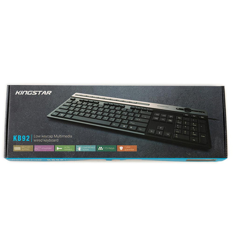 کیبورد «KB92» محصولی از شرکت «کینگستار » است که به صورت باسیم و از طریق درگاه USB به کامپیوتر متصل میشود. این کیبورد دارای 115 کلید، برای انجام فعالیتهای کامپیوتری است؛ همچنین کیبورد KB92 دارای 10 کلید میانبر برای انجام سریعتر کارهاست که شامل Web Home - Music - Play/Pause - Pre Track - Next Trac- Volume - Stop - Closure - Power - Dormant - My Computer - E-Mail -Refresh -Favorites - - Calculator - در قسمت بالای کیبورد قرار گرفتهاند. کیبورد کینگستار مدل KB92، برای استفادههای روزمره مناسب است.