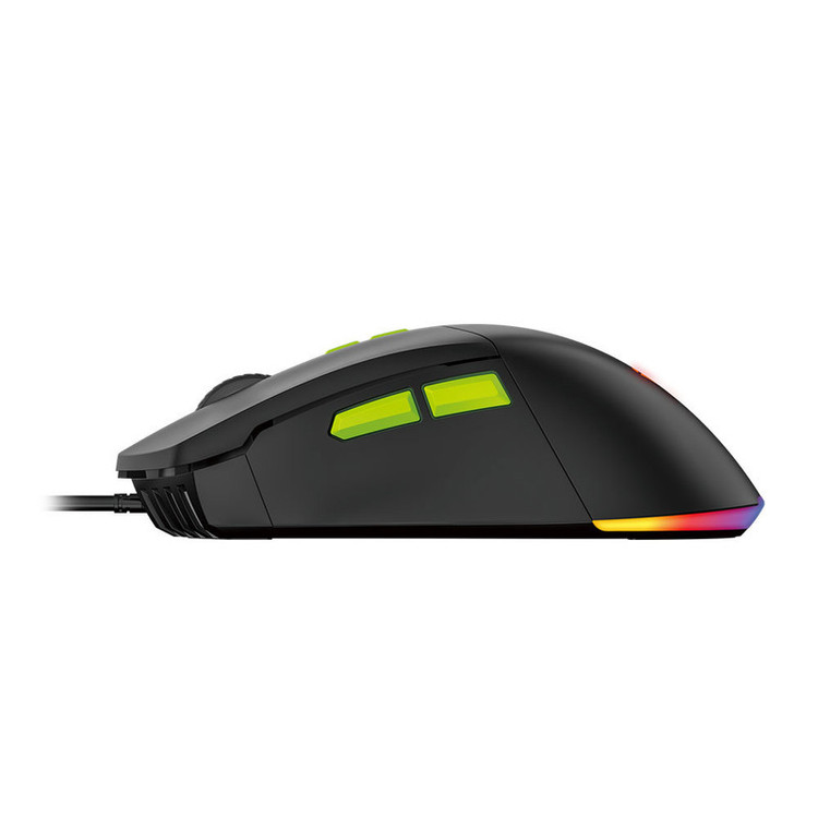 دارای نورپرداز RGB، دارای 7 کلید بر روی ماوس، طول عمر 20 میلیون بار کلیک، تا 7200 DPI دقت قابل تنظیم، حاوی کابل کنفی به طول 1.8 متر