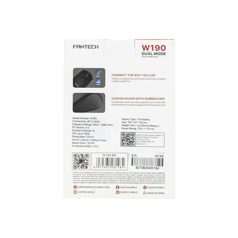 این کالا با 6 کلید دارای قابلیت اتصال هم به وسیلهی دانگل USB 2.4 گیگاهرتز و هم به وسیله بلوتوث نسخه 5.0 میباشد. ماوس وایرلس فنتک مدل W190 با محدوده عملکرد 10 متر از کیفیت بسیار بالایی برخوردار است. همچنین علاوه بر قابلیت انتقال و عملکرد سریع، با 3 میلیون بار کلیک از طول عمر قابل توجهی برخوردار است. این ماوس بیسیم دارای قابلیت تنظیم دقت تا بیش از 1600 DPI میباشد که برای کاربران میزان مناسبی است.