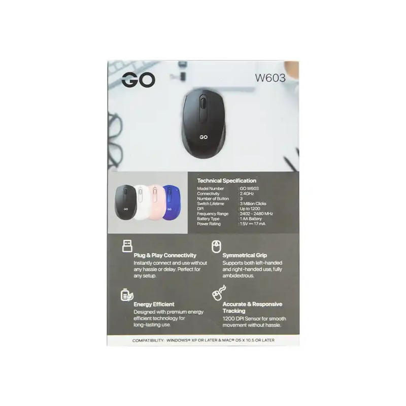 اتصال از طریق دانگل USB (2.4 گیگاهرتز)، طول عمر ماوس 3 میلیون بار کلیک، دارای رزولوشن 1200 DPI ، دارای 3 کلید