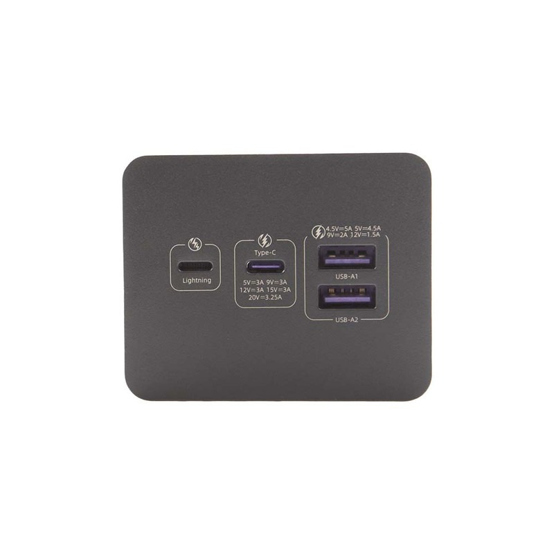 ورودی:Lightning: 5V/2A – 9V/2A, Type-C: 5V/3A – 9V/3A – 12V/3A – 15V/3A – 20V/3.25A خروجی:Type-C: 5V/3A – 9V/3A – 12V/3A – 15V/3A – 20V/3.25A, USB-A1,A2: 4.5V/5A – 5V/4.5A – 9V/2A – 12V/1.5A
