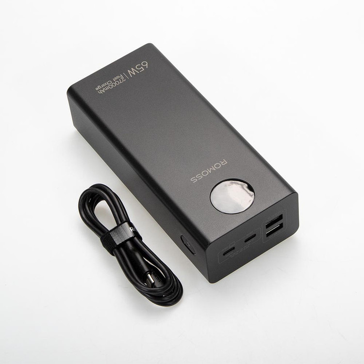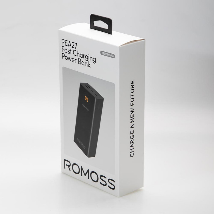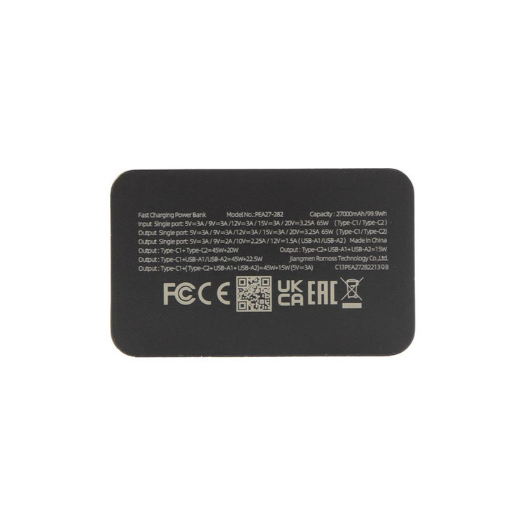 پاوربانک PEA27-282 دارای 4 پورت میباشد که شامل 2 پورت مشترک ورودی/خروجی تایپ سی و 2 پورت خروجی USB-A است. پورتهای ورودی به همراه نرخ ولتاژ و جریان آن عبارتند از: پورت Type-C1,C2 ورودی: 5V/3A – 9V/3A – 12V/3A – 15V/3A – 20V/3.25A نرخ ولتاژ و جریان پورتهای خروجی این کالا نیز عبارتند از: پورت USB-A1/A2 خروجی: 5V/3A – 9V/2A – 10V/2.25A – 12V/1.5A پورت Type-C1,C2 خروجی: 5V/3A – 9V/3A – 12V/3A – 15V/3A – 20V/3.25A این پاوربانک با حداکثر توان خروجی 65 وات دارای نمایشگر دیجیتال جهت نمایش میزان شارژ است. همچنین این محصول دارای وزن 655 گرم است که در کلاس وزنی پاوربانکهای نیمه سنگین قرار دارد. ابعاد این شارژر همراه نیز 160.6 × 69.8 × 43.2 میلیمتر است.این پاوربانک در رنگ مشکی با ظرفیت 27000 میلی آمپر دارای باتری لیتیوم پلیمری است که قابلیت شارژ لپ تاپ را نیز دارد. همچنین این کالا از رویه ضد خش و جنس بدنه آن نیز پلاستیک ABS است که مهمترین خاصیت آن ضد اشتعال بودن کالاست. از اقلام همراه این پاوربانک فست شارژ نیز میتوان به دفترچه راهنما و کابل شارژر دوسر تایپ سی اشاره کرد.