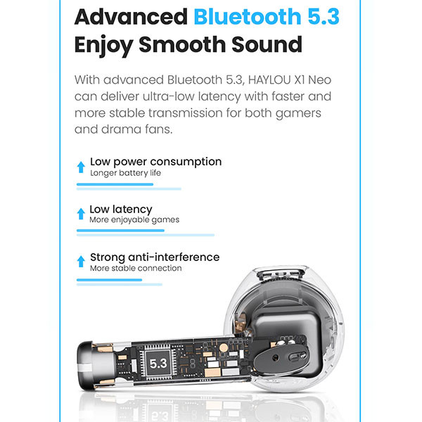 طراحی ایرفون های هندزفری بلوتوث Haylou X1 Neo به صورتSemi In-Ear است که به شکل کامل درون گوش جای میگیرند و به محض اینکه آنها را درون گوش خود میکذارید، کم شدن نویز و صداهای اضافی محیط را متوجه میشوید. وزن 3.87 گرمی هر هندزفری را نیز در نظر بگیرید که در مجموع باعث شده تا در طولانی مدت امکان استفاده از آن را داشته باشید و کمتر خسته شوید. هندزفری هایلو X1 Neo دارای قابلیت تاخیر کم بوده که این هندزفری را برای بازی کردن و فیلم دیدن مناسبتر میسازد. برای فعال سازی این حالت کافی است پنل لمسی هندزفری سمت راست را لمس کرده و به مدت 3 ثانیه نگه دارید. هندزفری هایلو X1 Neo دارای بلوتوث نسخه 5.3 است. با استفاده از این هندزفری می توان تا فاصله ده متری (بدون هیچ مانعی) بدون افت کیفیت به موسیقی گوش داد. از دیگر قابلیتهای بلوتوث نسخه 5.3 اتصال پایدارتر است. اگر گوشی شما نیز دارای نسخه 5.3 بلوتوث باشد، باتری استفاده شده از هندزفری و گوشی، کمتر خواهد بود. این ویژگی تنها زمانی رخ خواهد داد که گوشی نیز دارای نسخه 5.3 بلوتوث باشد. بر روی هندزفری X1 Neo ، پنلهای لمسی قرار داده شده است که با لمس کردن این پنلها میتوانید کاربردهای مختلفی را که هایلو برای شما در نظر گرفته است انجام داده و در کل کاربری راحتتری داشته باشید. پخش و قطع موسیقی: یک بار ضربه به یکی از پنلهای لمسی پاسخ به تماس یا قطع کردن: یک بار ضربه به یکی از پنلهای لمسی زدن موسیقی به ترک بعد: 2 بار ضربه به پنل لمسی سمت راست زدن موسیقی به ترک قبل: 2 بار ضربه به پنل لمسی سمت چپ رد تماس: دو بار ضربه به یکی از پنلهای لمسی فعال کردن حالت تاخیر کم: 3 بار ضربه به پنل لمسی گوشی سمت راست داک شارژ هندزفری بلوتوث Haylou X1 Neo دارای باتری با ظرفیت 310 میلی آمپر ساعت است. میزان شارژدهی برای ایرفون های این هندزفری جهت شنیدن موسیقی 5 ساعت و حدود 30 ساعت در مجموع با داک شارژر میرسد.باید توجه داشت که این میزان از شارژدهی با در نظر گرفتن شرایط آزمایشگاهی مورد سنجش قرار گرفته، بنابراین ممکن است که در شرایطی که شما از هندزفری استفاده میکنید، این اعداد کمی متفاوت باشد. شارژ هندزفری نیز بوسیله پورت تایپ سی موجود روی بدنه آن انجام میشود. به محض باز کردن درب کیس هایلو X1 Neo هندزفری به آخرین دستگاهی که متصل بوده، وصل میشود.