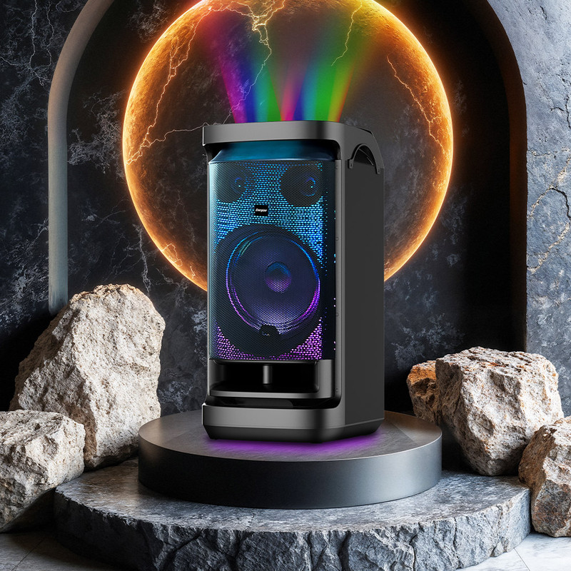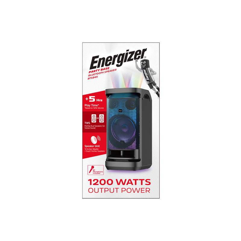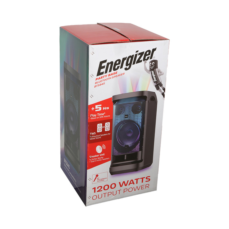 اسپیکر بلوتوث انرجایزر مدل BTS845 از جدیدترین محصولات پرقدرت و پرطرفدار کمپانی بزرگ انرجایزر است. این هیولای دوست داشتنی، با بیس قوی، تجربهای هیجان انگیز از لذت شنیدن موسیقی را به شما ارائه میدهد. این روزها با توجه به محبوبیت و افزایش تقاضای اسپیکرهای پارتیبوم و پارتی راکر، شرکتهای زیادی به طراحی و تولید این گونه محصولات میپردازند. به همین دلیل اقسام گوناگونی از این محصولات به بازار عرضه شده است. هرکدام از این محصولات شامل ویژگیهای خاصی هستند و برای قشر عمدهی کاربران طراحی و تولید شدهاند. از مهمترین ویژگیهای اسپیکر انرجایزر مدل BTS845 میتوان به یک ساب ووفر 12 اینچی به همراه دو توییتر 3 اینچی اشاره کرد. دو چرخ در زیر اسپیکر تعبیه شده تا امکان حمل و نقل راحتتر برای کاربران نیز فراهم گردد. همچنین دارای توان خروجی بالای 120 وات و توان لحظهای 1200 وات است. یکی دیگر از ویژگیهای مورد پسند این محصول، مربوط به نورپردازی آن است که دارای طیفهای رنگی متنوع هم در قسمت درایورها و هم در قسمت پنل اسپیکر میباشد. مورد دیگری که میتوان بعنوان ویژگی پرطرفدار به آن اشاره کرد، قابلیت پشتیانی از بلوتوث، AUX , USB و کارت حافظه است. باتری این اسپیکر نیز از نوع لید اسید قابل شارژ با ظرفیت 12 ولت 9 آمپر ساعت است. علاوه بر موارد گفته شده در ارتباط با طراحی و کارایی این مدل، باید به مدت زمان استفاده از آن نیز اشاره نمود که حدود 2 ساعت با میزان صدای 100٪ و حدود 5.5 ساعت با میزان صدای 50٪ را پشتیبانی میکند. علاوه بر آن مدت زمان شارژ این کالا حدود 8 الی 10 ساعت خواهد بود. همچنین اسپیکر پارتی بوم BTS845 با ابعاد 410*440*860 میلیمتر و وزن 23.6 کیلوگرم مناسب برگزاری مهمانی و انواع دورهمی نیز خواهد بود. این محصول با بلوتوث نسخه 5.0 و محدوده عملکرد 10 متر، دارای پاسخ فرکانس بین 60 هرتز تا 20 کیلوهرتز است. از اقلام همراه این کالا باید به میکروفون بیسیم، کابل برق متناوب شهری، کنترل از راه دور، کابل صوتی AUX به AV ، کابل دوسر تایپ سی و دفترچه راهنما اشاره کنیم.