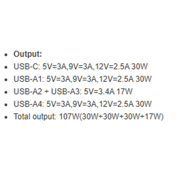 Type-C: 5V/3A – 9V/3A – 12V/2.5A (30W), USB-A1,A4: 5V/3A – 9V/3A – 12V/2.5A (30W), USB-A2+A3: 5V/3.4A (17W)