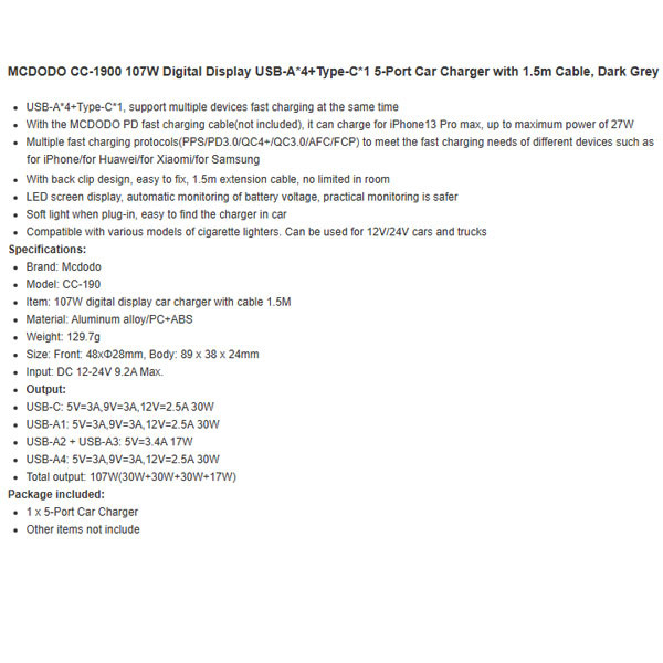 شارژر فندکی مک دودو مدل CC-1900 (ضمانت اصالت + گارانتی معتبر اصلی)