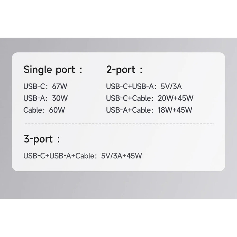 Type-C Cable: 5V/3A – 9V/3A – 12V/3A – 15V/3A – 20V/3A (60W), Type-C: 5V/3A – 9V/3A – 12V/3A – 15V/3A – 20V/3.35A (67W), USB-A: 5V/3A – 9V/3A – 12V/2.5A – 20V/1.5A (30W)